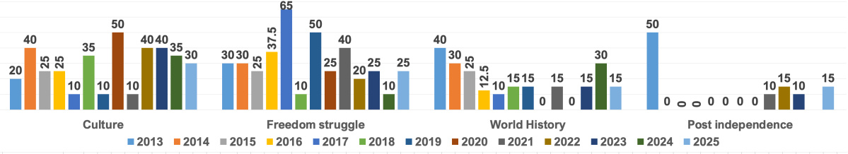 | History | Freedom struggle | 30 | 30 | 25 | 37.5 | 65 | 10 | 50 | 25 | 40 | 20 | 25 | 10 | 25 |