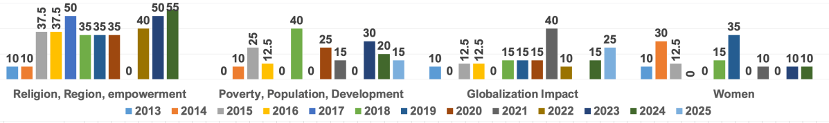| Society | Poverty, Population, Development | 0 | 10 | 25 | 12.5 | 0 | 40 | 0 | 25 | 15 | 0 | 30 | 20 | 15 |